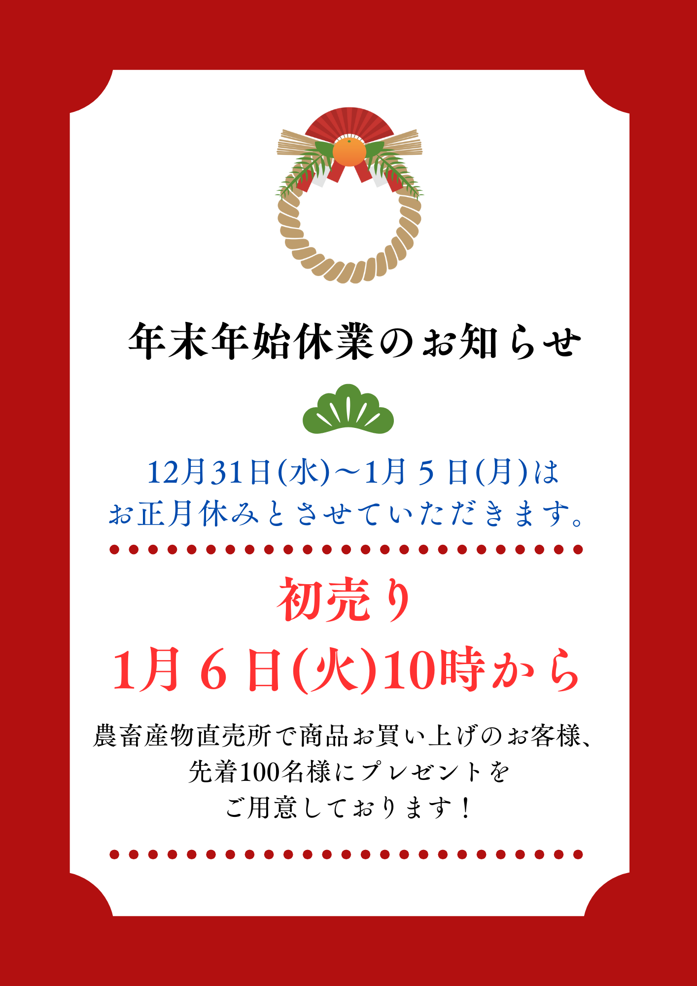 いつもホクレンくるるの杜をご利用いただき誠にありがとうございます。 2025年の営業は12月30日(火)が最終となります。 新年は1月6日(火)より営業いたします。 2026年も引き続きご愛顧のほど、よろしくお願い申し上げます。