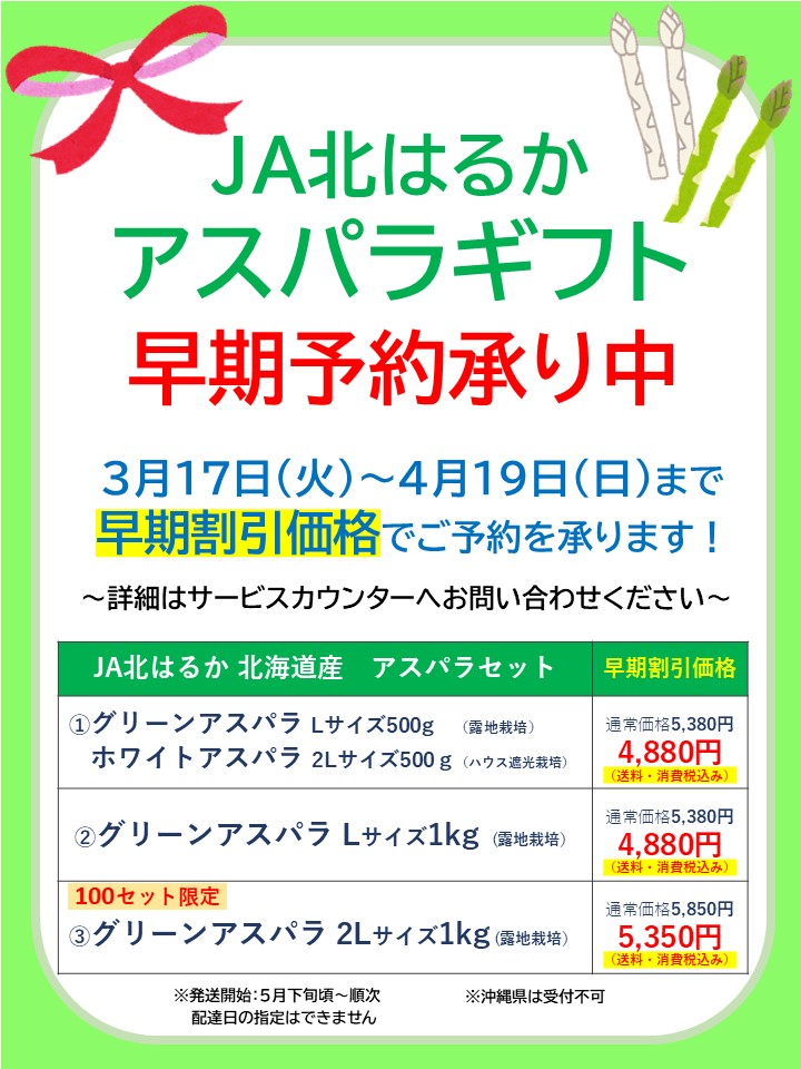 毎年ご好評いただいております、『JA北はるかアスパラギフト』の早期予約受付中です。 4月19日(日)までは早期割引価格にてご予約を承ります。 ぜひお早めにお申し込みください!